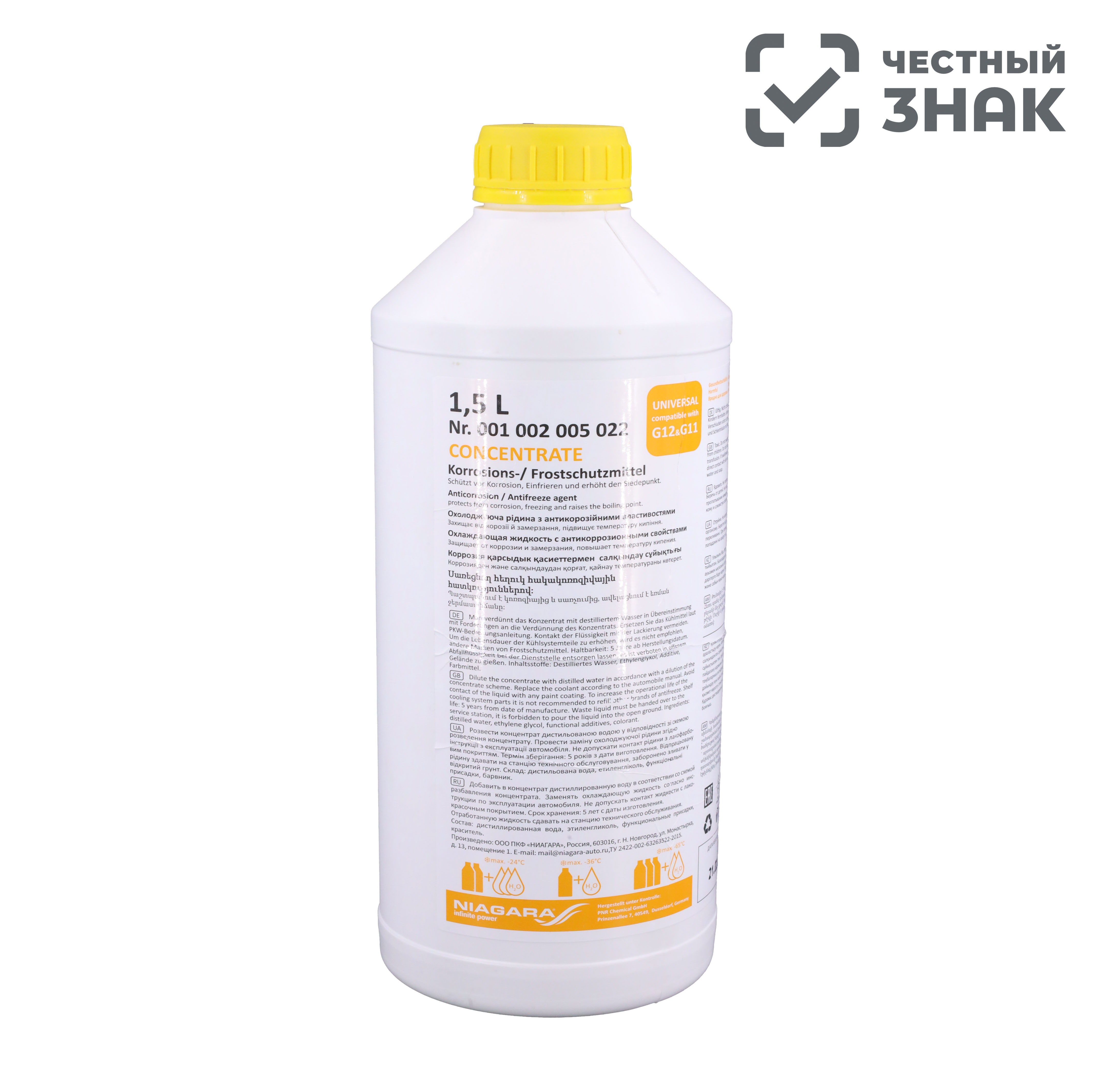 Антифриз NIAGARA UNIVERSAL G11&G12 concentrate произведен под контролем немецкой компании PNR Chemical GmbH. Разработан специально для доливки в любых соотношениях и полной замены в случаях, когда неизвестно, какой антифриз использовался ранее. ПРИ СМЕШЕНИИ НЕ МЕНЯЕТ СВОЙСТВА И ЦВЕТ ПЕРВОНАЧАЛЬНОГО АНТИФРИЗА. Прекрасно подходит для использования в качестве самостоятельного продукта. Специальный пакет функциональных присадок позволяет смешивать антифриз NIAGARA UNIVERSAL с любыми современными антифризами класса G11 (гибридные) и G12 (карбоксилатные), которые не содержат фосфаты, нитриты и амины, без риска ухудшения потребительских свойств уже находящейся в ней охлаждающей жидкости, ее загеливания или выпадения осадка.