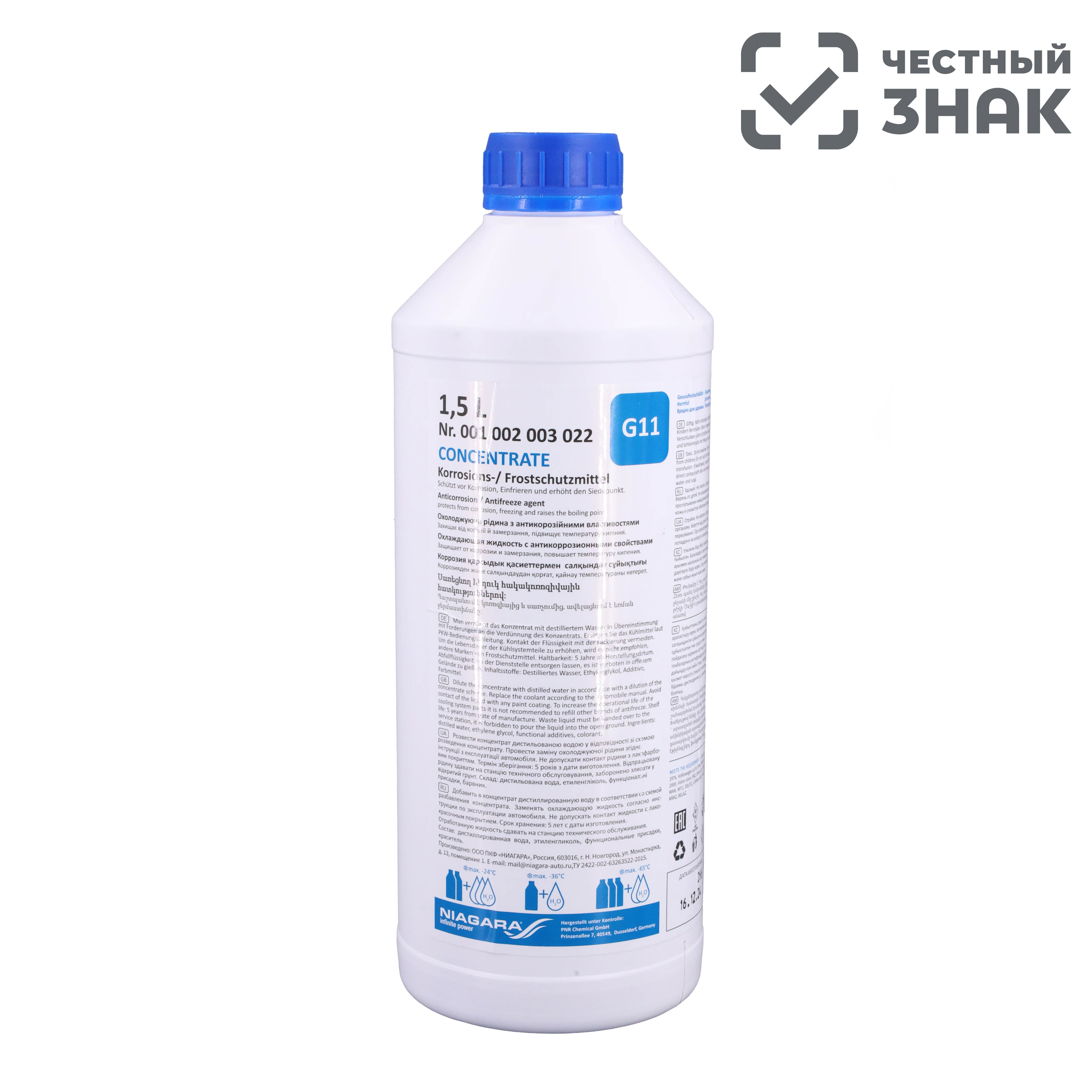 Гибридный антифриз нового поколения NIAGARA Blue G11 concentrate разработан в сотрудничестве и под контролем немецкой компании PNR Chemical Gmbh в Германии. Предназначен для использования в системах охлаждения современных высокофорсированных двигателей. Рекомендован для эксплуатации в тяжело нагруженных автомобилях. Содержит комбинированный пакет антикоррозионных и смазывающих присадок, обеспечивающий эффективную и долговечную защиту системы охлаждения двигателя от замерзания, перегрева и коррозии.